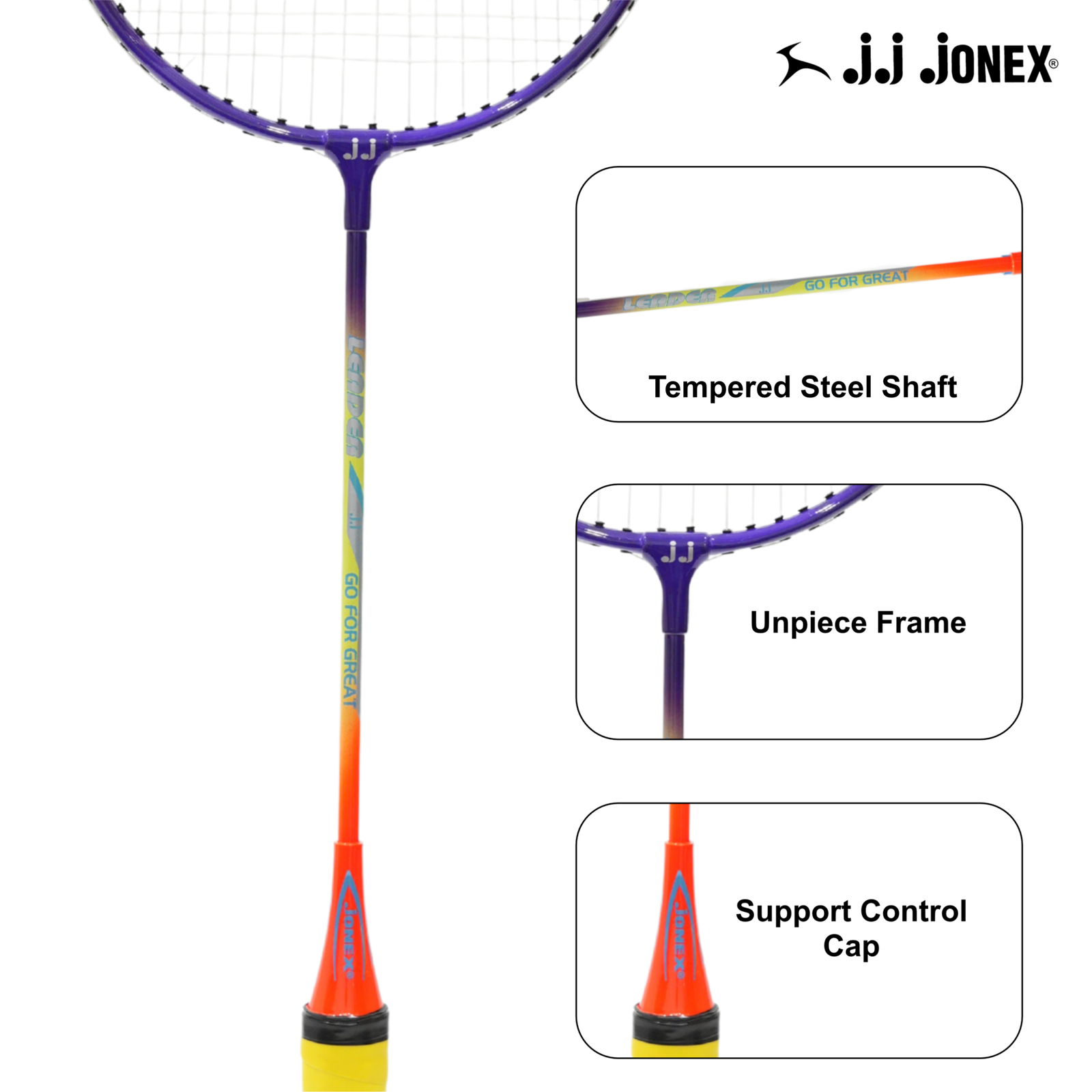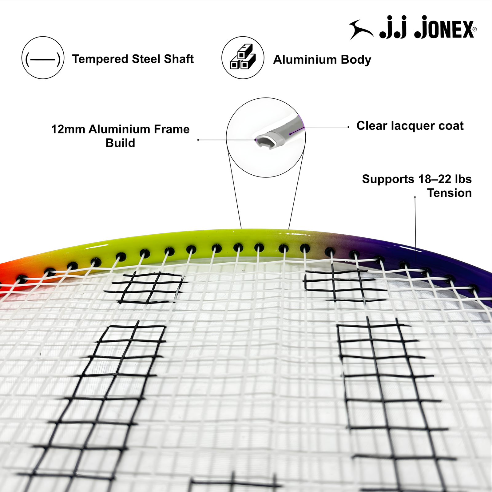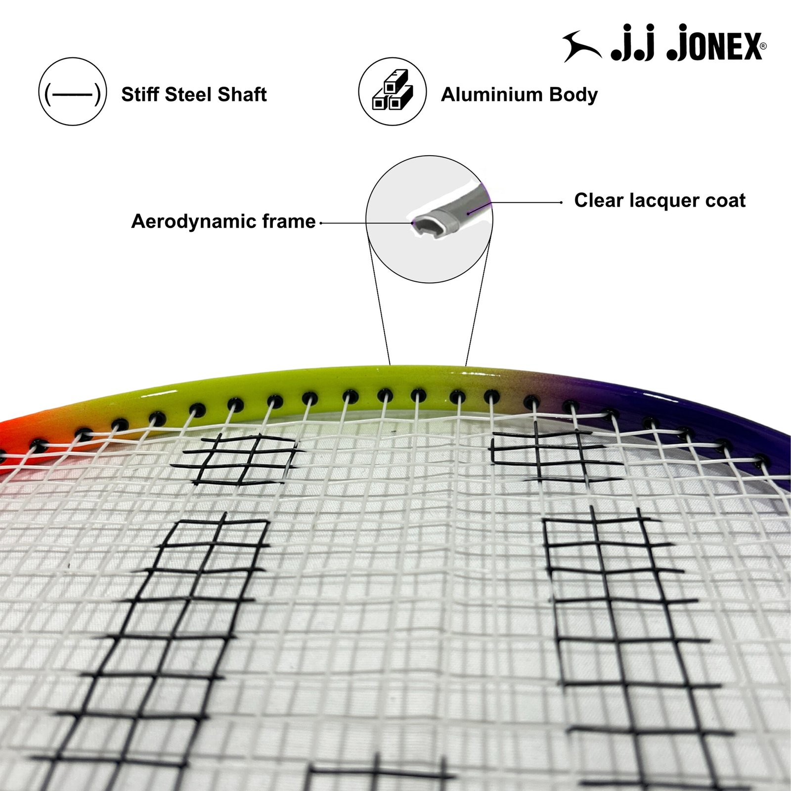 The Jonex Leader Set is engineered for strength, durability, and reliable performance. Its 12mm aluminium frame paired with a tempered steel shaft ensures stability, precise shot-making, and long-lasting use. Weighing 105 g ±5 with a length of 66–67 cm, it offers a balanced feel suitable for both power and control. Supporting string tensions of 16–18 lbs, this racket adapts well to varied playing styles. The fibre handle provides a firm, comfortable grip, making it ideal for extended sessions on the court.